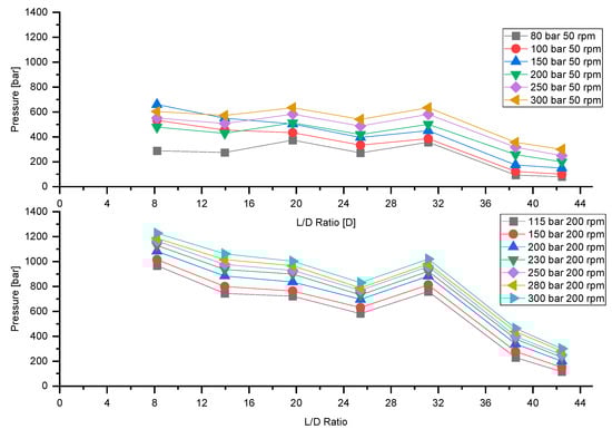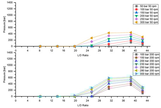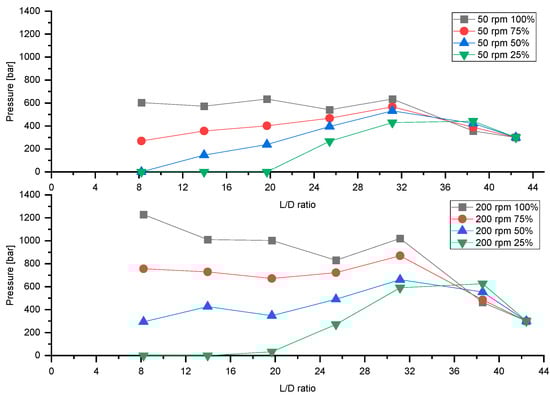 Figure 8 plots the overall pressure build-up as a function of backpressure at a feeding rate of 100% for screw speeds of 50 rpm and 200 rpm; with rising backpressure, the pressure in all other zones increases, which is typical in extrusion.