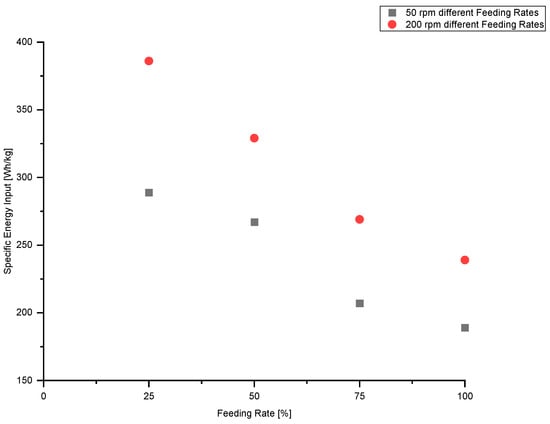The relationship between feeding rate and specific energy input for screw speeds of 50 rpm and 200 rpm is shown in Figure 10.