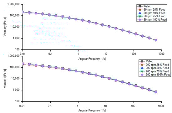 where is the ratio of the viscosities at a shear rate of 0.01 s−1, is the viscosity of the extruded sample at a shear rate 0.01 s−1 and is the viscosity of the pellet at a shear rate 0.01 s−1.