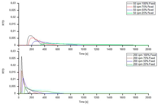 The residence time distribution of the different screw speeds with different feeding rates can be seen in Figure 12.