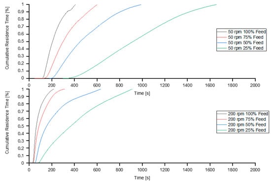 Influence of screw speed on cumulative residence-time distribution at screw speeds of 50 rpm and 200 rpm and 25% feeding rate.
