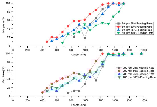 Melting performance for screw speeds of 50 and 200 rpm at various feeding rates.