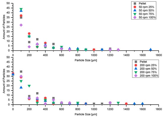 In Figure 15 and Figure 16, the distributions of VHMWPE in the pellet and in samples extruded at screw speeds of 50 rpm and 200 rpm at various feeding rates can be seen. At very low screw speed (50 rpm) and low feeding rates (25% and 50%), the VHMWPE particles are markedly elongated, which has not been reported elsewhere. At high feeding rates, no significant influence on the shape of VHMWPE particles is evident.