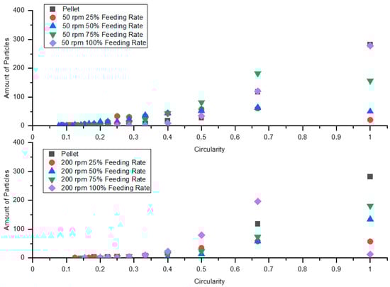 The circularity parameter was used to analyze the shape of the VHMWPE particles. A value of one indicates a perfect cycle, while lower values reflect elongation of the particle shape. All particles smaller than 45 µm2 were ignored, and the remaining ones were classified according to circularity. Table 11 and Table 12 list number of particles and mean and median values of circularity for samples extruded, respectively, at screw speeds of 50 rpm and 200 rpm at various feeding rates.