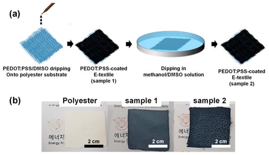 The PEDOT:PSS solution filtered with a nylon syringe filter (pore size = 0.2 μm) was dripped onto the fabric substrate (5.0 × 5.0 cm2). The solution was instantaneously spread out over the textile by penetrating into the fabric pores, so the first sample (sample 1) of the E-textiles was completed after drying by heat gun. The second sample (sample 2) was prepared by immersing sample 1 into the methanol/DMSO solution (4.5 wt.% of DMSO in methanol) at room temperature for 7 min, followed by heat-gun drying. Two side edges of the sample were coated with silver paste (Sigma-Aldrich, St. Louis, MO, USA) and then placed at room temperature for drying.