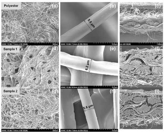 Scanning electron microscopy (SEM) images showing morphology of the pristine textile (a–c), sample 1 (d–f), and sample 2 (g–i) at low magnification (a), medium magnification (b,c) cross-sectional SEM images.