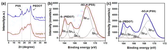Figure 4a displays the diffractograms of PEDOT:PSS-coated E-textiles. For the PEDOT:PSS thin film, the low angle reflections at 2θ = 3.8° and 6.6° corresponded to the lamella stacking distance d(100) of two distinct alternate orderings of PEDOT and PSS, whereas the two high angle reflections at 2θ = 17.7° and 25.6° are indexed to the amorphous halo of PSS and the inter-chain planar ring-stacking distance of d(010) of PEDOT, respectively [31]. It is interesting that sample 2 exhibited more intense peak at 2θ = 25.6° as compared to sample 1, rather than 2θ = 17.7°. The XPS of the PEDOT:PSS films on the textile substrate was investigated to study the oxidation level of PEDOT films. As shown in Figure 4b,c, the S2p peaks of PEDOT:PSS were specified by two distinct types of sulfur atoms in the thiophene unit in PEDOT and the sulfonate group in PSS, respectively. The broad peak at higher binding energy was attributed to the S2p3/2 and S2p1/2 peaks of the sulfonate groups in PSS while the S2p3/2 and S2p1/2 doublet peaks were attributed to the sulfur atoms in PEDOT due to the oxidation of thiophene unit in the PEDOT chains [32]. The increased ratio of S2p in PEDOT to that of PSS in sample 2 indicated that the PSS chains were effectively removed by the solvent treatment (dipping in methanol/DMSO) [33]. It is suspected that the effective removal of PSS by solvent treatment also affected the self-assembly of PEDOT chains, as confirmed by XRD analysis (Figure 4a). Thus, the removal of insulating PSS would contribute to enhanced electrical conductivity of the PEDOT:PSS-coated E-textiles. In addition, the increased crystallinity of PEDOT chains also facilitated electron transport along the PEDOT:PSS films of the E-textiles [23,34].