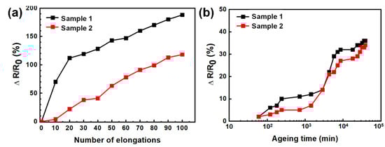 Sheet resistance variation of E-textiles under stretching (a) and ageing test (b).