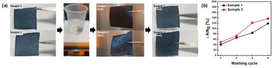 To enable the practical use of the E-textiles, it should be able to endure the washing process. As shown in Figure 6a, we simply assessed the washing reliability of the E-textiles by immersing the samples in deionized water with a stirring at 1500 rpm for 30 min. The textiles were then dried by heat gun for 3 min between each washing cycle. The sheet resistance increased to 120% and 135 % for sample 1 and sample 2, respectively, after four washing cycles. (Figure 6b) The increase in the sheet resistance may have been due to oxidation of the PEDOT chain as the samples were contacted with water molecules. The sheet resistance increase of sample 2 was higher than sample 1, which would be due to the larger surface area of the PEDOT:PSS film in the E-textiles. As such, it is suspected that the PEDOT:PSS of sample 2 would dissolve or collapse upon contact with water, as the electrical conductivity is greatly reduced as compared to sample 1, which has an adverse effect on the practical use of the E-textile [36].