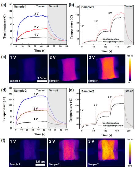 The equation of Joule’s law constructs the power (P), the applied voltage (V), and resistance (R). As shown in Figure 7, the Joule heating properties of the textile heaters were examined. The temperature distribution of textile heater at different applied voltages was confirmed using an IR camera and FLIR software. Figure 7a shows the maximum temperature of the heater fabricated with of sample 1. The DC applied voltage was supplied to the textile heater through contact electrodes. The temperature is exhibited for an applied voltage of 1 to 3 V. The temperature increased with the increasing applied voltage and the temperature distribution was uniform. When the applied voltage was 3 V, sample 1 was operated with a maximum temperature of ~108 °C. The response time reaching 90% of maximum steady-state temperature of sample 1 was within 18 s at a bias of 3 V. Since the response time until the heaters reached a steady state temperature was an important parameter in evaluating the performance of the heater, the rapid thermal response was another favorable feature of the E-textiles in practical applications [37,38]. Figure 7d showed the time-dependent change in the temperature of sample 2 with a gradually increasing applied bias. Sample 2 exhibited impressive thermal properties with a maximum temperature to 138 °C. The response time also varied depending on the applied voltage, but it was found to be very fast within 20 s. As shown in Figure 7c,f, both IR images of the two-film heater present uniform temperature distribution.