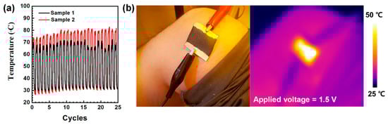 (a) Cyclic test of Joule heating properties of the E-textiles under a bias of 1.5 V and (b) the thermal patch application of sample 2 at the knee.