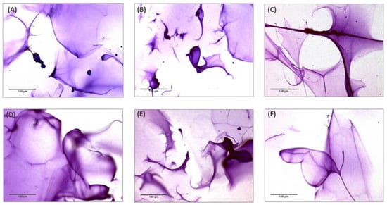 Optical microscopic examination (10×) of six HA dermal fillers cross-linked with PEGDE after staining with Toluidine Blue 1%. (A) HA hydrogel 22 mg/mL; (B) HA hydrogel 24 mg/mL; (C) HA hydrogel 26 mg/mL LR; (D) HA hydrogel 26 mg/mL LV; (E) HA hydrogel 26 mg/mL with CaHA; (F) HA hydrogel 28 mg/mL.