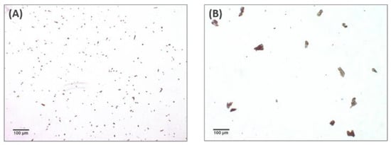 Optical microscopic examination of 18 mg/mL HA non cross-linked dermal filler containing 0.01% CaHA after staining with Toluidine Blue 1%. (A) Magnification 4×; (B) magnification 10×.