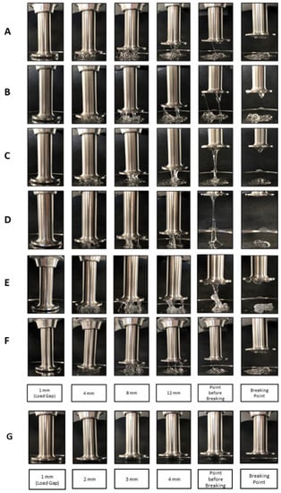 Vertical elongation comparison between seven dermal fillers illustrating the tendency of a cohesive product to stick to itself. (A) HA hydrogel 22 mg/mL; (B) HA hydrogel 24 mg/mL; (C) HA hydrogel 26 mg/mL LV; (D) HA hydrogel 26 mg/mL LR; (E) HA hydrogel 26 mg/mL with CaHA; (F) HA hydrogel 28 mg/mL; (G) HA non cross-linked hydrogel 18 mg/mL. For each sample, the load gap (1 mm) and the standard intermediate gaps of 4-8-12 mm and 2-3-4 mm, respectively, for the cross-linked (A–F) and non-cross linked (G) fillers, were evaluated together at the point before breaking and at the breaking point.