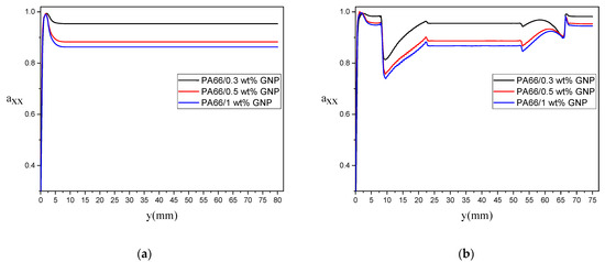 According to Figure 15 and Figure 16, it can be concluded that GNPs alignment is increasing for streamlines near the wall as the same behavior is found in previous papers in the literature [47,49,66]. Also, a matrix with a lower GNP additive shows more alignment of particles along the flow direction. Therefore, the great improvement of tensile/flexural properties of PA66/GNP nanocomposites for the PA66/0.3 wt% GNP can be related to the alignment of reinforcements in the domain.