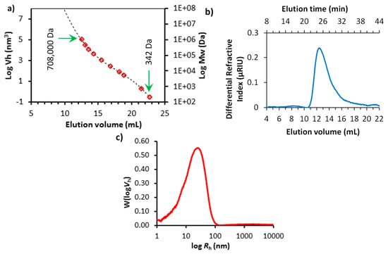 (a) Standard curve obtained from the elution profiles of pullulan standards by size exclusion (SEC) HPLC, presented as log(hydrodynamic volume, Vh) vs. elution volume (molecular weights of the pullulan standards are also presented on the right-hand Y-axis). (b) Elution profile of averaged starch samples (n = 2) and (c) average chain length distribution of starch: SEC weight distribution, W(logVh), expressed as a function of hydrodynamic radius (Rh) of pullulan standards (the elution profiles of the pullulan standards can be seen in Figure S1).