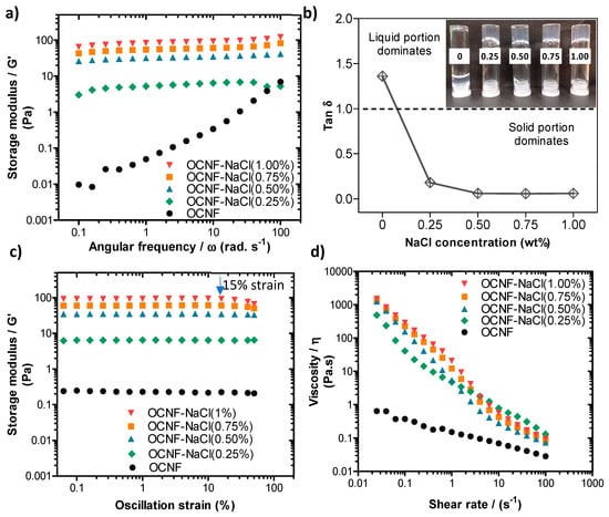 The addition of NaCl salt at various concentrations (0.25, 0.50, 0.75, and 1.00 wt%) to the aqueous dispersion of OCNF (1 wt%) was studied to determine the effect on the rheological properties. Fukuzumi et al. reported that TEMPO-oxidised cellulose nanofibrils in dilute aqueous dispersions (0.1 wt%) were homogeneous up to 50 mM NaCl (~0.29 wt%) and formed aggregated gel particles at 100 mM NaCl (~0.58 wt%), but the gel became separated into two phases (gel and supernatant) at ≥200 mM NaCl (~1.16 wt%) [6]. Therefore, mixtures of OCNF (1 wt%) with >1 wt% NaCl were avoided in this study. The storage moduli (G′) of OCNF gels were seen to increase with the salt content, as illustrated in Figure 3a. The pure OCNF gels (1 wt%, without salt) had a frequency-dependent linear increase of G′, suggested to arise due to dynamic transient interactions among the fibrils [43]. Addition of salt to the OCNF (1 wt%) dispersion caused the mixture to show a less frequency dependent G′, represented by the negligible slope of the curves in Figure 3a. Increasing ionic strength screens electrostatic repulsion forces between the cellulose fibrils, hence enhancing fibril–fibril attraction, resulting in a denser fibrillar network and the formation of a stiffer gel [35]. This is in agreement with the tan δ (=G″/G′, with G′ and G″ being the storage and loss modulus, respectively) curves obtained for the OCNF/salt gel system at a fixed frequency of 1 Hz (6.28 rad s−1) (as presented in Figure 3b). The addition of salt to the OCNF suspension results in drastic changes in tan δ, which goes from >1 (i.e., G″ > G′) characteristic of fluid in the absence of salt to tan δ < 1, which is the signature of a gel, after salt addition. The photos (inset in Figure 3b) also demonstrate the formation of self-standing stiffer gels in the presence of salt. Here, the addition of 0.50 wt% (~86 mM) NaCl content to the OCNF gel (1 wt%) was sufficient to achieve stronger interactions among the fibrils without any noticeable precipitation, as at higher salt concentration, no significant change in the tan δ values were observed.