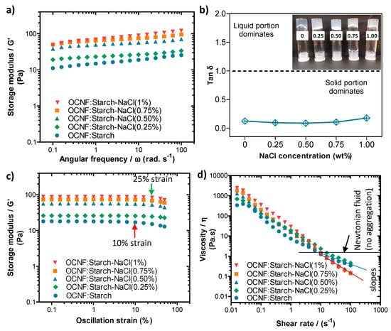 Figure 3d shows the flow behaviour of the gels, where the dependence of apparent viscosity (η) with respect to the shear rate of the gel systems are presented. The OCNF (1 wt%) gels with various concentrations of NaCl possessed shear thinning properties. The addition of salt to the OCNF gels (0.25 wt% NaCl) induced a significant increase of η and shear dependency.