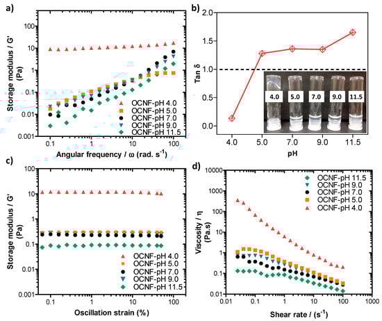 (a) Oscillatory frequency sweeps, (b) tan δ values, (c) amplitude sweeps, and (d) shear flow curves of OCNF (1 wt%) dispersions at various pH conditions (pH 4, 5, 7, 9, and 11.5). Inset in (b) is a photograph of the samples labelled by their pH.