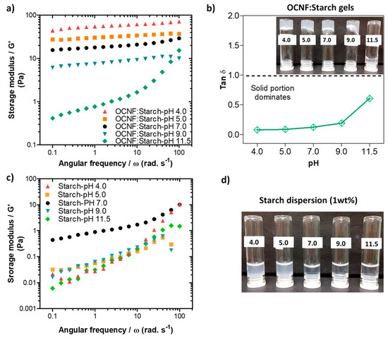 (a) Oscillatory frequency sweeps and (b) tan δ data for the OCNF:starch (1:1 wt%) blends at different pH (4, 5, 7, 9, and 11.5). Inset in (b) is a photograph of the samples labelled by their pH. (c) Frequency sweep curves and (d) photograph of the control starch (1 wt%) dispersions produced at the various pH values.