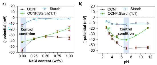 ζ-potential values (with standard deviation, n = 5) of OCNF, starch, and OCNF:starch (1:1) hydrogels (0.1 wt% in DI water): (a) with increasing NaCl content up to 1 wt% and (b) at various pH conditions.