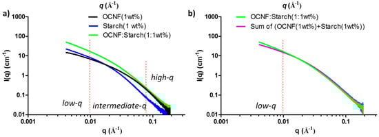 (a) Small-angle X-ray scattering (SAXS) patterns of the OCNF:starch blend hydrogels and (b) comparison between the SAXS curve of the blend hydrogel (green) with the calculated curve obtained by adding the signal of the two individual components (purple).