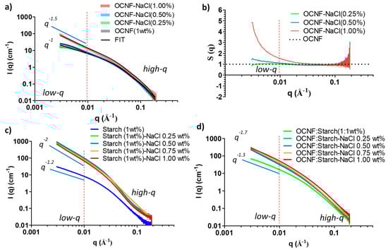 (a) SAXS patterns of OCNF (1 wt%) suspensions at various salt concentrations, (b) structure factor, S(q) of OCNF/salt gels obtained by dividing the signal of the blend gels by the scattering pattern from an OCNF suspension measured without salt, (c) SAXS patterns of starch (1 wt%)/salt, and (d) the OCNF:starch (1:1 wt%)/salt systems.