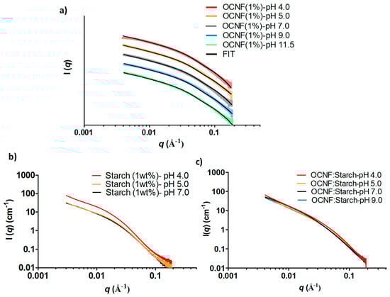 SAXS patterns of the gels at various pH: (a) OCNF (1 wt%) (offset was used for clarity), (b) starch (1 wt%), and (c) OCNF:starch (1:1 wt%).