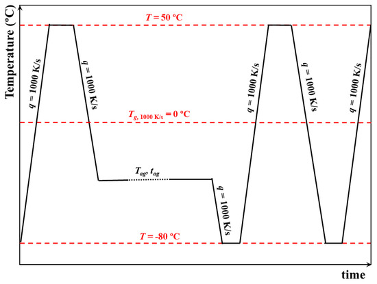 - Sakatsuji, W.; Konishi, T.; Miyamoto, Y. Origin of two maxima in specific heat in enthalpy relaxation under thermal history composed of cooling, annealing, and heating. Phys. Rev. E 2016, 94, 062501. [Google Scholar] [CrossRef]