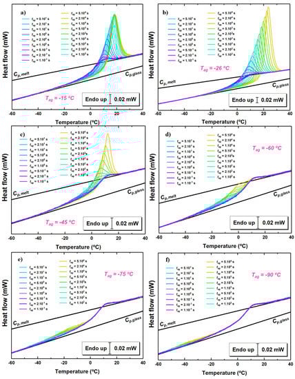 The heat flow rate as a function of temperature at 1000 K/s for different aging times and at some selected aging temperatures is shown in Figure 3. In all cases, aging induces the development of an endothermic overshoot whose size increases with aging time. Aging at temperatures not too far from results in the standard behavior with a narrow overshoot in proximity of the step of the glass transition. When the aging temperature is decreased, the endothermic overshoot progressively shifts to lower temperature. At −45 C, for short aging times, the endothermic overshoot is well separated from the step at the glass transition, whereas, for longer aging times, it progressively overlaps with such step, similarly to aging at higher temperature. Aging at even lower temperatures shows the endothermic overshoot resulting from physical aging at an even lower temperature range, well separated from the step at the glass transition. In these cases, no signature of aging is present in proximity of .