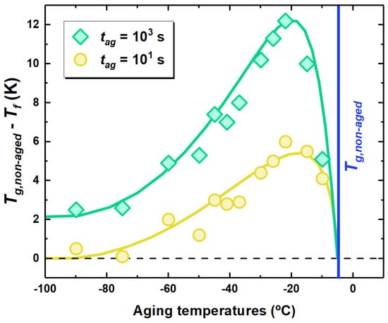A way to obtain insights on the physical aging behavior relies on the isochronal representation, where the thermodynamic state in terms of is shown as a function of the aging temperature at a fixed aging time. This is shown in Figure 4 for two aging times, where the difference of the polymer to the obtained after given aging conditions is shown. This difference is zero in unaged samples. First inspection of the figure shows the typical signature of physical aging, i.e., a maximum in the reduction of , in line with previous reports [36,37,51,52]. This behavior is explained considering that the physical aging depends on two counteracting factors: the molecular mobility triggering the evolution of the thermodynamic state and the distance of the glass from equilibrium, i.e., the thermodynamic driving force. Close to , the former factor is large, being the glass at relatively high temperature. Hence, the glass will rapidly evolve towards equilibrium. However, the distance from equilibrium will be small; therefore, only limited reduction of are allowed. Decreasing the aging temperature entails an increase of the thermodynamic driving force, which implies an increase of to a maximum. For aging times of 10 and 1000 s (see Figure 4), this maximum is located at −25 C. The presence of a temperature maximum in the amount of recovered enthalpy implies that there exists an optimum aging temperature to maximize equilibrium recovery at fixed aging time [53]. At lower aging temperatures, the slowing down of molecular mobility becomes dominant; therefore, the reduction in over limited aging time scales progressively decreases. Importantly, this reduction takes place smoothly over a temperature range of dozens of degrees. In the case of samples aged for 1000 s, a decrease in persists even at C. As a result, aging way far from is not suppressed as one would expect if only the relaxation, whose time scale diverges below , was considered.