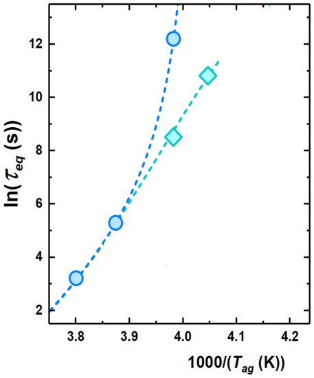 To obtain a typical time scale for physical aging, a model-independent route consists of considering the aging time needed to attain each plateau in . This is shown by arrows in Figure 5. In the conditions shown in this figure, only one time scale is obtained at the highest investigated aging temperatures. At −22 C, two time scales can be detected, whereas, at lower temperatures, either only the time scale of the fast process of equilibrium recovery or no time scale at all can be detected. An overview of the kinetics of equilibrium recovery, in terms of time scale to reach equilibrium, , is shown in Figure 6. At high temperatures, i.e., close to , only one time scale, associated to the monotonous decay to equilibrium, can be observed. Lower aging temperatures entail a split into two time scales: (i) the slow one, associated to the relaxation, with increasing in a super-Arrhenius fashion with decreasing temperature, thereby becoming to large to be observed not far below ; and (ii) a fast time scale exhibiting milder temperature dependence and seemingly decreasing activation energy with decreasing temperature.