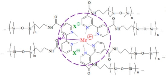 In this work, we used PDMS crosslinked through metal–bpy coordination with nine different crosslinking salts (bpyPDMS-MeX2, where Me: Ni2+, Mn2+, or Zn2+; and X: Cl−, Br− or I−). Their chemical structures are presented in Figure 1. All complexes were synthesized from detailed descriptions of their synthesis reported elsewhere [10].