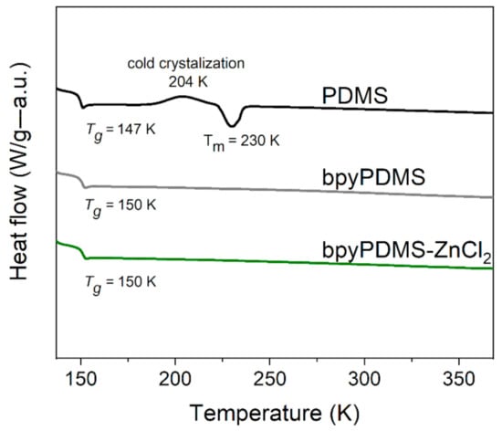 Figure 2 presents DSC thermograms for neat PDMS, bpyPDMS, and the exemplary bpyPDMS-ZnCl2 metalloorganic complex. In the case of neat PDMS, a characteristic step typical for glass transition was observed at 147 K (as a midpoint). Other two processes detected at higher temperatures are connected with the crystalline phase. One of them is located at around 204 K, has an exothermic nature, and corresponds to the process of cold crystallization. The second one appears as a more pronounced exothermic peak at about 230 K, revealing melting of the crystalline PDMS phase. In the case of bpyPDMS and other organometallic complexes, one transition at about 150 K was observed and assigned to the Tg of investigated materials. These measurements evidenced that incorporation of bpy moieties suppressed the crystallization process of PDMS and led to the creation of fully amorphous systems (see Figure 2) [10]. It is important to underline that the structures of all investigated complexes were amorphous, and similar thermograms were detected for all organometallic complexes.
