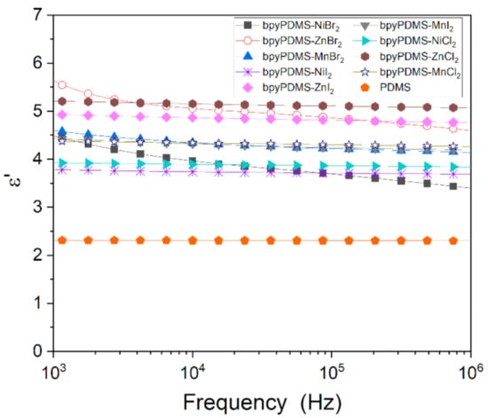 Studies of frequency dependence of the real part of dielectric permittivity ε′ at 293 K of PDMS and metalloorganic complexes are shown at Figure 3. All samples exhibited a flat response over a broad frequency range. It can be observed that metalorganic materials are characterized by elevated values of dielectric permittivity as compared with neat PDMS. Such behavior is caused by the dipolar metal-ligand coordination bonds in PDMS materials crosslinked by metal-ligand coordination [13,14]. All bpyPDMS-MeX2 systems displayed elevated dielectric permittivity, depending on the type of cation originating from the metal salt; the dielectric permittivity increased in this order: neat PDMS < Ni2+ < Mn2+ < Zn2+. The highest dielectric permittivity, almost twice as high as for neat PDMS, was observed for bpyPDMS-ZnCl2, which is in accordance with our previous findings [10].