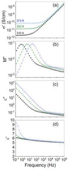 At lower frequencies, conductivity is determined only by the migration of electric charges and reaches a certain constant value, called a plateau value, which is representative of σdc (Figure 4a). Based on the experimental data, it is possible to predict the frequency at which the DC starts to dominate over AC’s contribution [26]. The increase in the signal in the loss part representation of dielectric permittivity (see Figure 4c) is due to the increase of DC’s conductivity contribution with increasing temperature. In the measured high-frequency range, dipole relaxations dominate in the dielectric response of the material. The beginning of the frequency-dependent conductivity corresponds to the characteristic time τc: