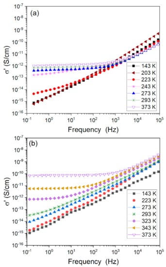 Contrary to this, DC conductivity is connected with the concentration and mobility of charge carriers; therefore, its contribution is facilitated and reinforced by cooperative movements of the polymer units or chains, which are characteristic of a viscoelastic or melted polymer state. The acceleration of polymer dynamics with temperature results in enlargement of the Coulombic cage [16,24] and increases the possibility of counter anion skipping.