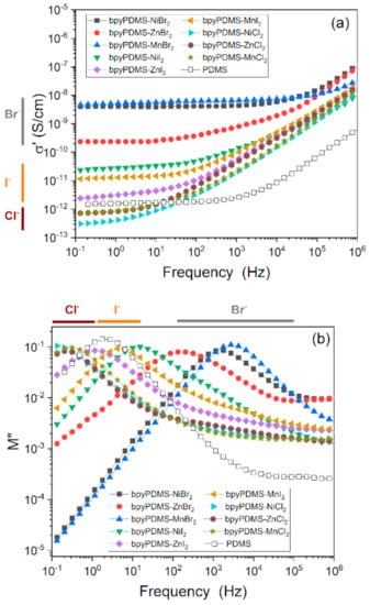 Among the studied anions, chlorides had the lowest values of conductivity and the smallest DC conductivity contribution to total conductivity response as compared to other organometallic materials and neat PDMS, which can be seen by the short plateau region. This is a result of varying diffusion properties depending on the size and electronegativity of the anion used (see Figure 6a). The recorded DC conductivity for chlorides ranged from 3.0 × 10−13 to 7.2 × 10−13 S/cm, for iodides from 2.5 × 10−12 to 3.3 × 10−11 S/cm, and for bromides from 2.5 × 10−10 to 4.5 × 10−9 S/cm, whereas neat PDMS exhibited a plateau at 1.5 × 10−12 S/cm. The anions present in the investigated organometallic complexes can be arranged in terms of increasing radius in the following order: Cl−, Br−, and I−; and their electronegativity arranges them in the reverse order. In the investigated systems, the coordination interaction between metal ions and bipyridine molecules proceeded spontaneously due to changes of Gibbs free energy, and more specifically due to an increase of entropy, whereas halide anions remained unbounded. This was well described by Li et al., who analyzed coordination bonds in self-healing polymers and arranged the complexing groups by classification of Lewis acids and bases [12]. Accordingly, iodides are classified as soft bases due to their intermediate electronegativity and large size, whereas chlorides and bromides are placed in the borderline group between soft and hard bases due to their higher electronegativities and smaller sizes. These parameters determine the interactions of these counter anions with the surrounding environment and affect their diffusion coefficients and mobilities. Following this model, the DC conductivities in the investigated system should have increased in the order: chlorides, bromides, iodides. Herein, the order between bromides and iodides was exchanged. The organometallic compounds comprising bromides exhibited the highest DC conductivities among the investigated system. They were also characterized by the broadest frequency, i.e., the long DC plateau region in the real part of conductivity. This phenomenon is partially connected with the highest mobility being possessed by the bromides among the halide anions used [31]. Considering that the conductivity of the studied system is a function of both charge density and charge mobility, it can be concluded that the highest conductivity of complexes based on bromide salts can be explained by the high density of mobile counter anions, which was most likely due to the weak Coulombic interaction between bromides and complexing metal.
