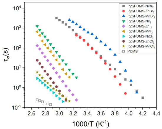 The activation map was obtained for the temperature interval 227–385 K, corresponding to the possible temperature range of applications of these materials. The visible maxima at the representation of M″(ν), which marks the beginning of the DC component, allowed us to create the relaxation map for neat PDMS and all measured organometallic complexes as a function of 1000/T; see Figure 7. On the basis of the conductivity relaxation time plot, different temperature regimes of the DC component occurrence can be observed. The map shows that the temperature of the occurrence of the DC component de pends on the counter anion used. The shapes of the obtained temperature dependences confirmed VFT type for bromides and Arrhenius type for the rest of the samples.