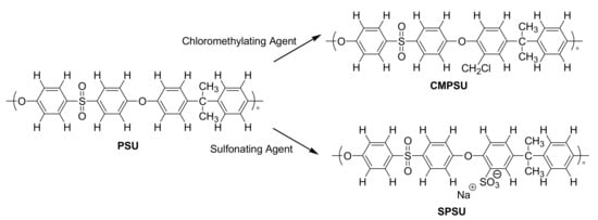 Sulfonated polysulfone (SPSU) was synthesized according to published data [31] and the scheme in Figure 1. In a three-neck round bottom flask (250 mL), 5.00 g of PSU was dissolved in 30 mL of DCE at room temperature under Argon atmosphere. After dissolving the polymer, TMSCS used as a sulfonating agent, dissolved in DCE, was added. SPSU was prepared by using 1:1 PSU:TMSCS molar ratio. The reaction was maintained for 24 h. SPSU obtained was precipitated in a 0.1 M solution of sodium hydroxide (NaOH) and the polymer was kept in a dry environment. Figure 1 shows a schematic route to obtain both CMPSU and SPSU.