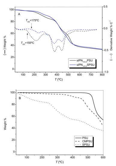 The thermal stability of the membranes has been studied by thermogravimetric analysis in the temperature range from 30 to 850 °C. As an example, Figure 4A shows the thermograms (weight and derivative weight versus temperature) of sIPN143,5-PSU and sIPN143,5-SPSU. TGA curves of the polymers isolated along the synthesis are also shown in Figure 4B.