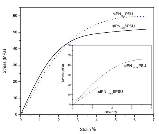To evaluate the mechanical properties of these membranes, a dynamo-mechanical analysis was performed. As an example, Figure 5 shows the stress-strain curves of some of the most representative membranes dry in the Cl− form. Thus, the effect that degree of chloromethylation, covalent crosslinking, and ionic crosslinking has on the mechanical behavior of membranes was evaluated through the pairs sIPN75,0-PSU and sIPN75,0-SPSU (Figure 5) and sIPN75,5-SPSU and sIPN143,5-SPSU (Figure 5 inset). Table 1 shows the tensile strength and elongation at break (ε) values obtained from the stress-strain curves of the membranes.
