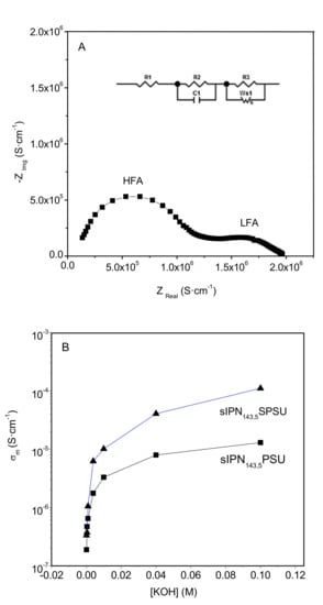 (A) Impedance plot of sIPN75,5-PSU-OH membrane and (B) Evolution of the OH− conductivity of sIPN143,5-PSU-OH and sIPN143,5-SPSU-OH membranes as a function of the KOH concentration. Measurements were performed at room temperature.
