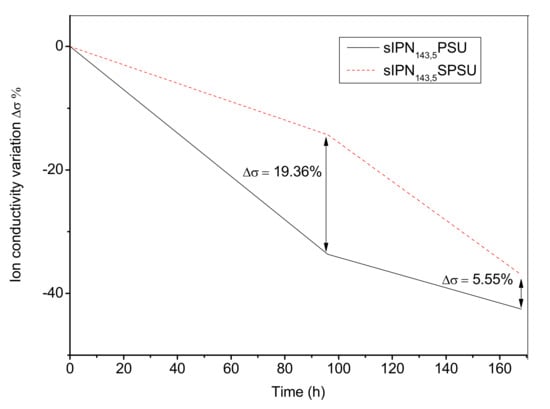 In all of the membranes studied, independently of the functionalization degree, a decrease in ionic conductivity was observed when they were treated in 1 M KOH solution after 96 and 168 h at room temperature. As an example, in Figure 7 the variation of the ionic conductivity observed for two membranes (sIPN143,5-PSU and sIPN143,5-SPSU) is shown.