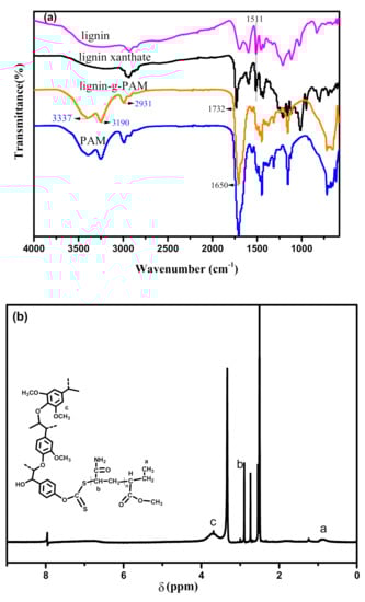 Two peaks appeared at 0.9 ppm and 3.7 ppm, as shown in the 1H NMR spectrum of lignin-g-PAM (Figure 2b), which are associated with the protons of the end –CH3 from the xanthates group and that of the methoxy group from lignin, respectively.