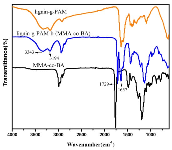 ATR-FTIR spectra of pure MMA-co-BA, lignin-grafted hybrid acrylate copolymer, and lignin-g-PAM.