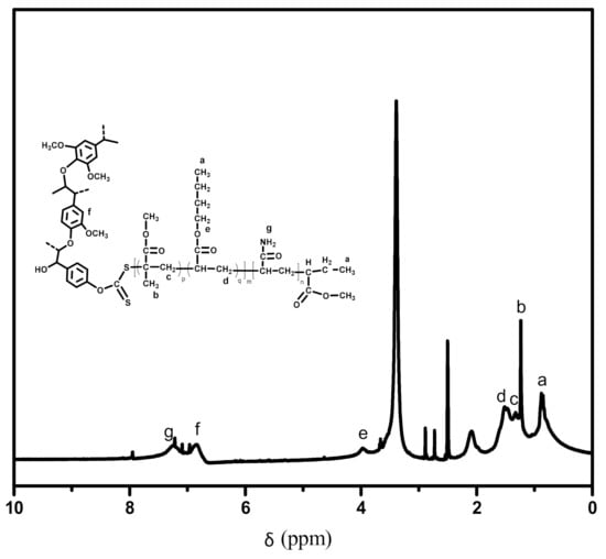 The ATR-FTIR spectra of the lignin-based hybrid acrylic resin and lignin-g-PAM are extremely alike, but the vibration of the carbonyl group corresponding to 1729 cm−1 in the spectrum of the lignin-grafted MMA-co-BA resin confirms that the ester groups were incorporated into the lignin-g-PAM by RAFT miniemulsion polymerization. The strong absorption of peaks appeared at 3343 cm−1 and 3194 cm−1 in relation to the –NH2 stretching vibration of the unbonded amine group and that of the associated group, respectively. In addition, an absorption band at 1657 cm−1 associated with C=O amide was also found, similar to previous literature reports [36]. The 1H NMR spectrum of the lignin-based hybrid acrylic resin clearly showed a peak at 0.87 ppm mainly corresponding to the protons on the end –CH3 of the alkyl chain for BA (Figure 5).
