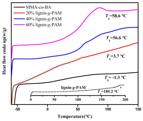 The glass transition temperature (Tg), manifesting the macromolecular chain’s flexibility of the lignin-grafted MMA-co-BA copolymers and pure acrylic resin (MMA-co-BA), was characterized through DSC. Figure 6 displays the Tg values of the pure MMA-co-BA copolymer and lignin-grafted hybrid acrylic resins. As expected, in this experiment, the Tg of the lignin-grafted hybrid acrylic resins was higher than that of the linear acrylic copolymer, in which the MMA-to-BA ratio was equal by mole. With the mass ratio of lignin-g-PAM to acrylic monomers increasing, the Tg of the lignin-grafted hybrid acrylic resin increased. Thus, the higher Tg followed the higher percentage of the lignin-based macromolecular RAFT agent consistently. The higher Tg of the lignin-grafted hybrid acrylic resins could be attributed to the incorporation of lignin-g-PAM. As presented in Figure 6, the glass transition temperatures of the lignin-grafted MMA-co-BA copolymers (3.7, 56.6, and 58.6 °C) existed between that of lignin-g-PAM (185.2 °C) and pure MMA-co-BA (−1.3 °C), which demonstrates that lignin-g-PAM-b-(MMA-co-BA) block copolymers synthesized through the RAFT miniemulsion polymerization. The shift in Tg is due to forming amounts of the homogeneous mixed phase [63]. The results should further underline the successful block-co-polymerization contributing to the low gel fraction (0.02–0.11%) listed in Table 1.