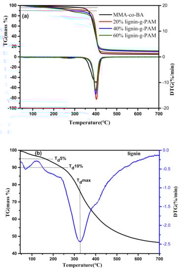 As listed in Table 2, the Td 5%, Td 10%, and Td max for lignin were lower than those of the MMA-co-BA and lignin-g-PAM-b-(MMA-co-BA) block copolymers. It was also observed that the Td 5%, Td 10%, and Td max for pure MMA-co-BA were higher than those for all obtained lignin-g-PAM-b-(MMA-co-BA) block copolymers. The results partly stem from the lignin incorporated in these block copolymers.
