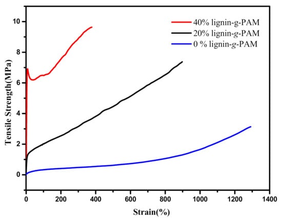 Strength–strain behaviors versus % of lignin-g-PAM for synthesis of lignin-grafted hybrid acrylic resins.